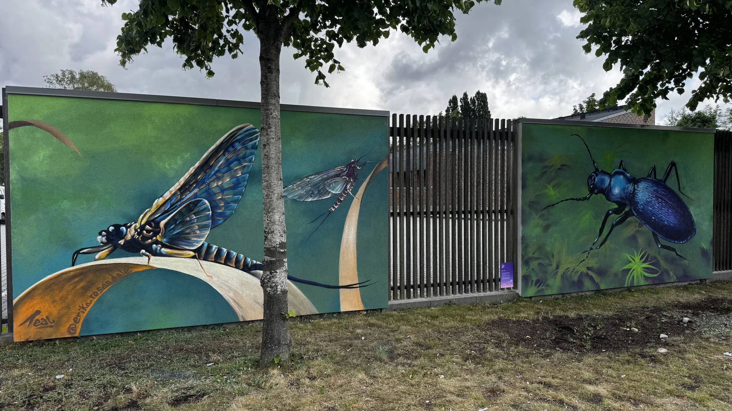 'Engangered Animals Series - Rithrogena germanica - European Mayfly & Blue Beetle' (1 & 2 of 3) - School in Vejle, Denmark - Vejle Street Art Festival, Summer 2025